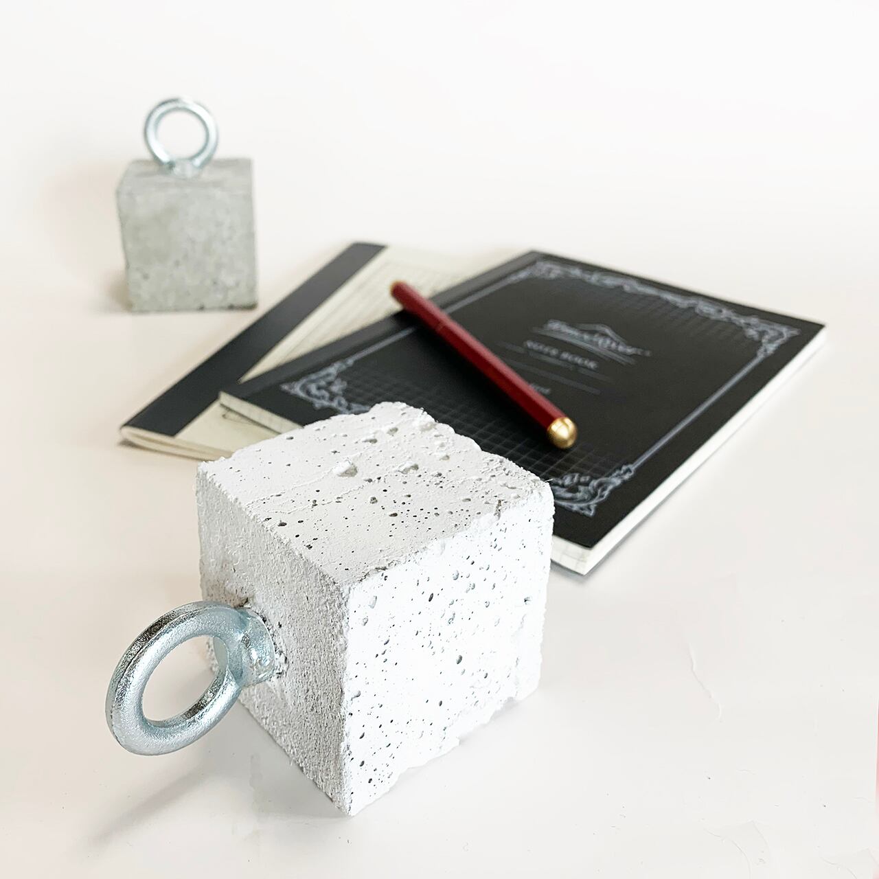 可愛い、ちょっと間抜けな、お洒落なオブジェ。セメント製の立方体に金具付きウエイトです、2個1組。適度な重さも程よく、テーブルの上のアクセントにGOOD! 店舗のディスプレイ、展示会の備品等でよく使われています、その場の雰囲気を和ませてくれるデザインです。※作家モノ・ハンドメイド商品のため、個体差、多少の汚れ、傷等がみられる場合があります、ご理解の程よろしくお願いします。