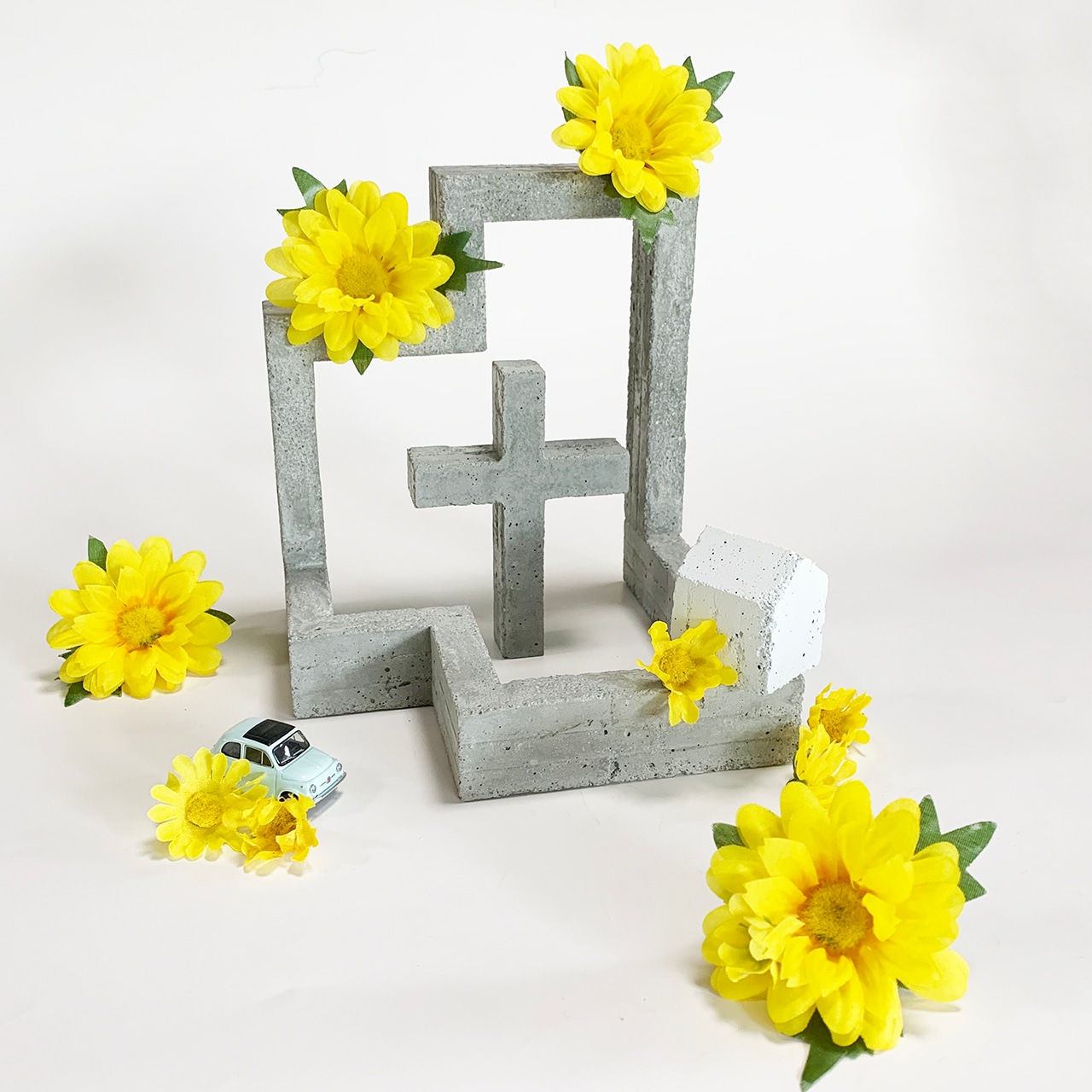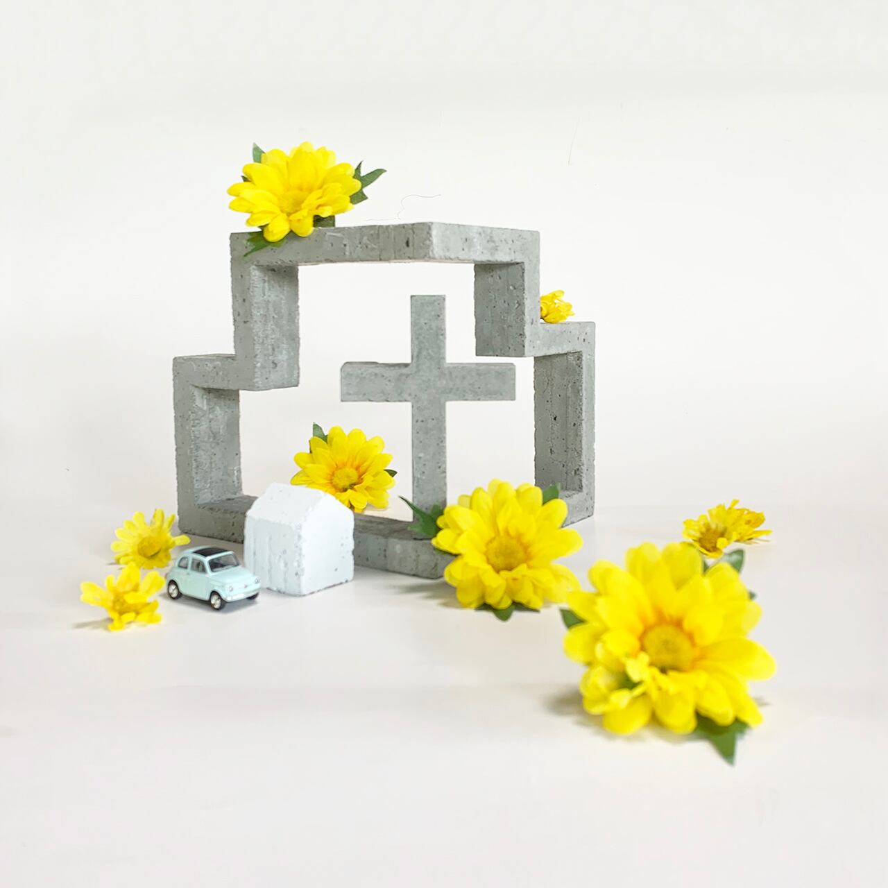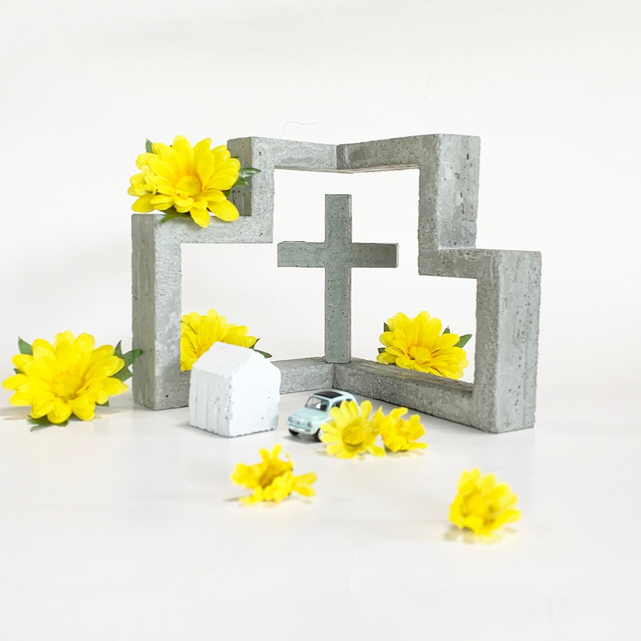 以前はオーダー・予約商品でしたが、このサイトで通常販売が開始されます。あなたのお部屋やオフィスなどさまざまな場所で存在感十分なセメント製の小さな祈りの場です。セレクトショップなどでは展示・ディスプレイにも使っていただいており、ご結婚後に二人の写真を添えて飾ったり、十字架と背面の複雑で面白い表情のオブジェ、お写真が自由にレイアウトできるのも毎日の楽しみになります。セメントのクールな質感、気泡、カケなどモダンな表情でお部屋にアクセントを与えてくれるでしょう。また、ご自分でカラーリングや装飾もできオンリーワンの小さなチャペルを楽しんでください。